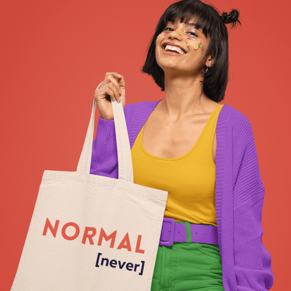 Presenting our awesome "Normal, Never" tote bag, a bold and empowering accessory that embraces the core message of "All Minds Count."
